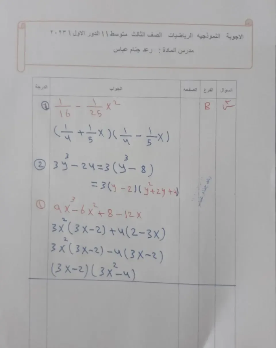 حل اسئلة رياضيات ثالث متوسط دور ثاني 2023